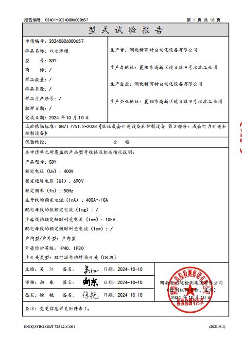 雙電源柜SDY型式試驗報告